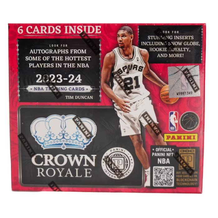 The 2023/24 Panini Crown Royal Basketball International Hobby Box brings a regal touch to basketball card collecting. Known for its unique die-cut designs and luxurious feel, this edition features an impressive lineup of NBA stars, rookies, and legends. Collectors can chase the iconic Crown Autographs, Silhouettes, and the exclusive Kaboom! inserts, which are sure to add immense value and excitement to any collection.