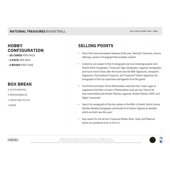 • Collectors can expect to find 4 Autographs per box including popular sets Rookie Patch Autographs, Treasured Tags Autographs, Logoman Autographs, and much more! Chase after the brand new All-NBA Signatures, Viewpoint Signatures, Personalized Treasures, and Treasured Talents Signatures for Autographs of the top superstars and legends from the game!