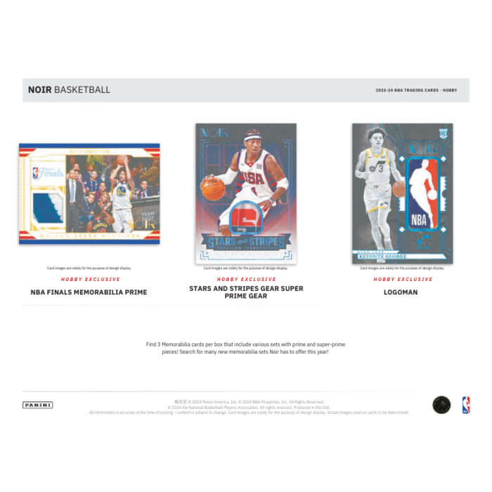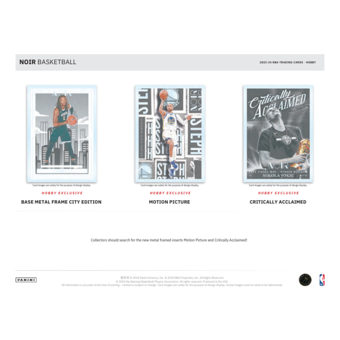 •  Noir returns with quality designs and on-card Autographs in which collectors can find 3 Base/Base Parallels or Inserts, 3 Memorabilia cards, and 4 Autographs per box!