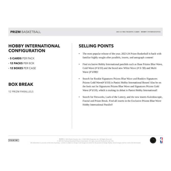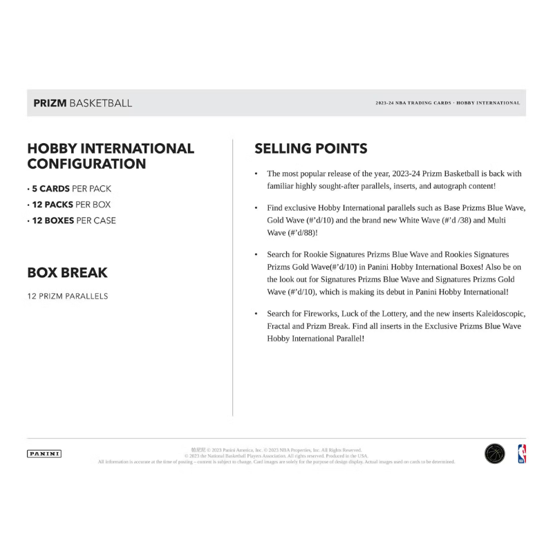 The 2023/24 Panini Prizm Basketball International Hobby Box is the ultimate treasure for basketball card enthusiasts. Renowned for its vibrant and glossy designs, this edition highlights the top NBA players, emerging rookies, and iconic legends. The 2023/24 Panini Prizm Basketball International Hobby Box is a must-have for those looking to capture the essence of the NBA in a spectacular way.