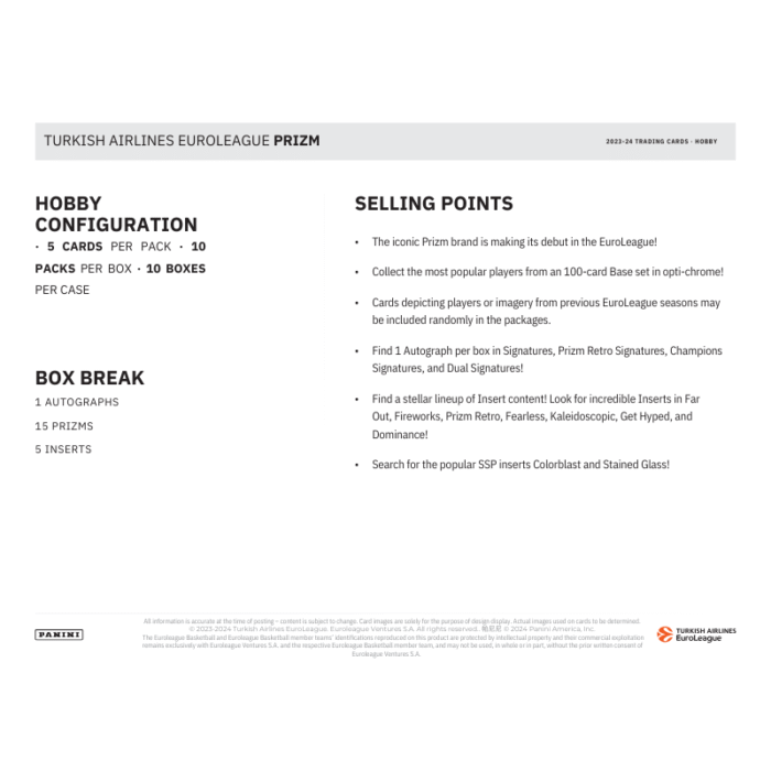– Cards depicting players or imagery from previous EuroLeague seasons may be included randomly in the packages.