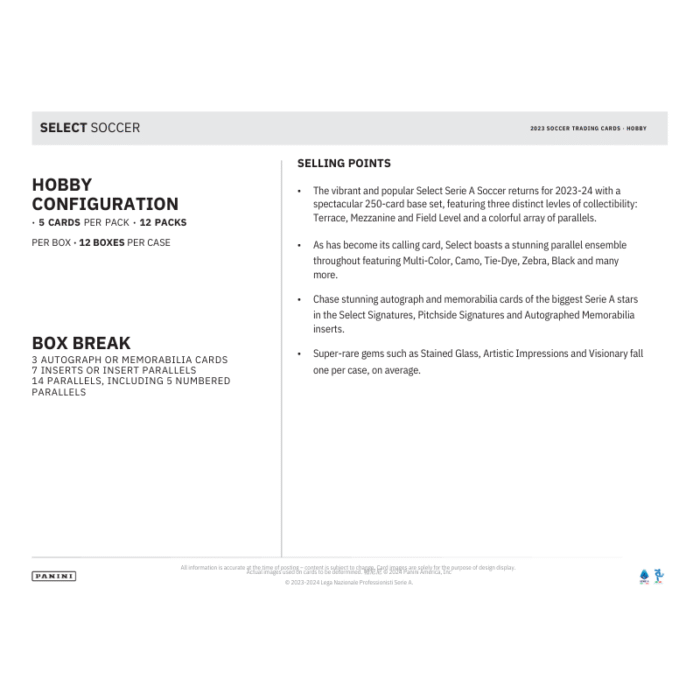 – The vibrant and popular Select Serie A Soccer returns for 2023-24 with a spectacular 250-card base set, featuring three distinct levels of collectability: Terrace, Mezzanine and Field Level and a colorful array of parallels.
