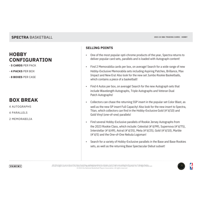 – Search for Base, Base Rookies and the return of the Base Spectacular Debut sets in a number of Hobby-Exclusive Parallels!