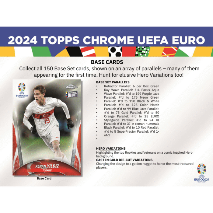 • Topps Chrome makes its UEFA EURO debut with Topps Chrome UEFA EURO 2024, featuring the brightest stars, rising talents and all the teams appearing at the 2024 UEFA European Championships!