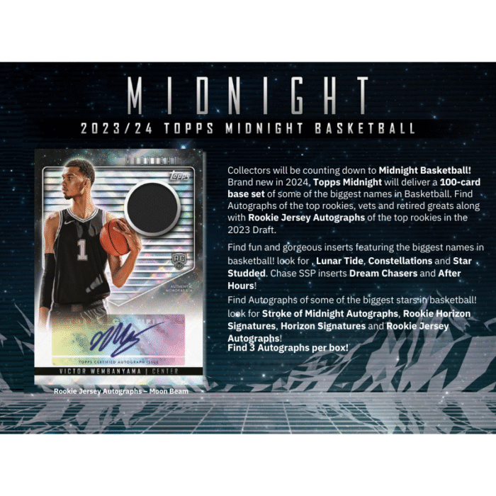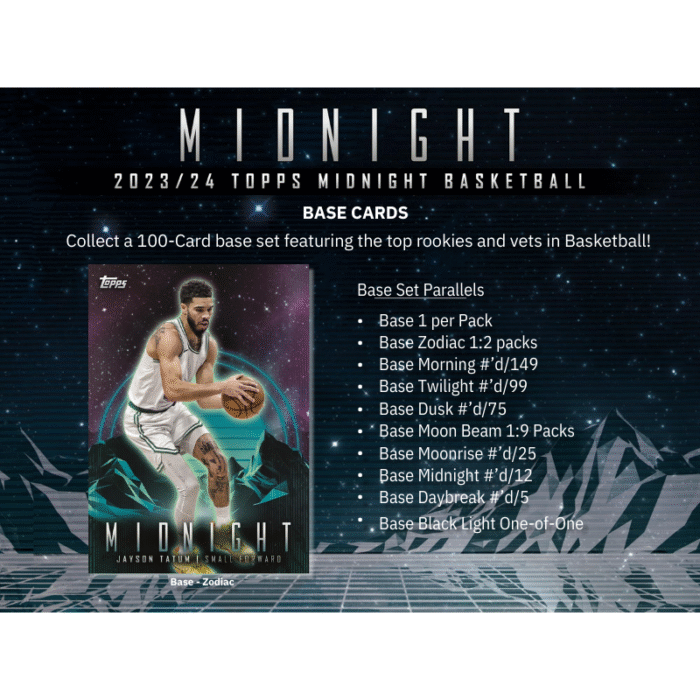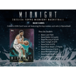 •  Collectors will be counting down to Midnight Basketball! Brand new in 2024, Topps Midnight will deliver a 100-card base set of some of the biggest names in Basketball.