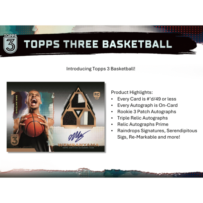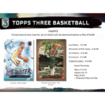 The 2023/24 Topps Three Basketball Hobby Box offers collectors a premium experience with every card numbered to 49 or less. Each box contains three packs, with one card per pack, totaling three encased cards per box. Collectors can anticipate two on-card autographs per box, featuring top rookies, veterans, and retired legends. The 100-card base set includes sought-after players, with parallels such as Bronze (#’d/25), Gold (#’d/10), Red (#’d/5), and Platinum One-of-One. Additionally, the product introduces new short-printed inserts like “Ice Water,” “Monsters of the Deep,” and “Architects,” each numbered to 49, with rarer parallels available.