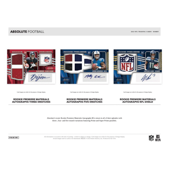 – Absolute’s iconic Rookie Premiere Materials Autographs RCs return in all of their splendor with three, four and five swatch variations featuring Prime and Super Prime parallels.
