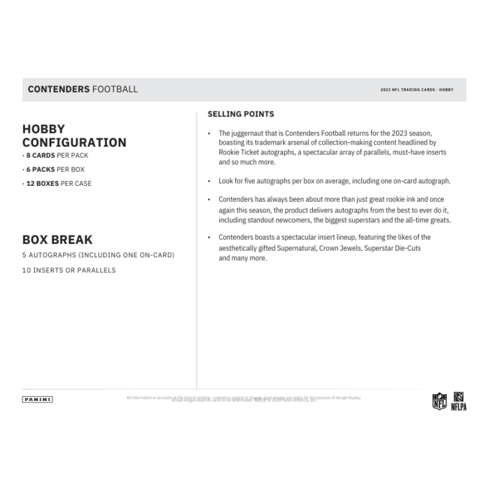 – The iconic Contenders Football returns with its trademark array of on-card autographs, featuring the top rookies in the game with the headlining Rookie Ticket RPS insert.