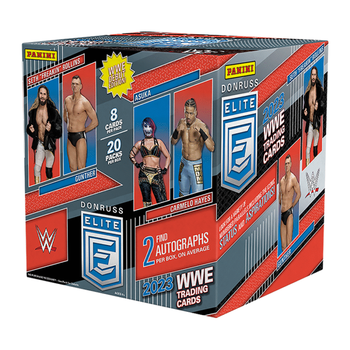 Step into the wrestling ring with the 2023 Panini Donruss Elite WWE Hobby Box, marking a historic fusion of the iconic Donruss Elite brand and the world of WWE! This box is a must-have for every wrestling enthusiast!