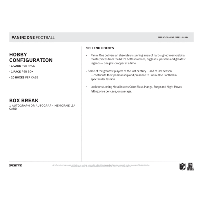 • Panini One delivers an absolutely stunning array of hard-signed memorabilia masterpieces from the NFL’s hottest rookies, biggest superstars and greatest legends — one jaw-dropper at a time.