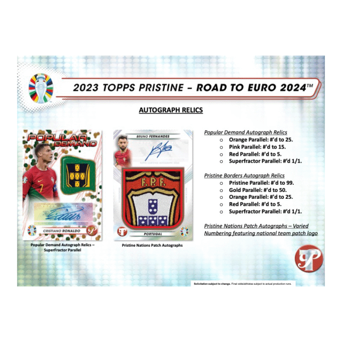 Score big with the 2023 Topps Pristine Road to Euro 2024 Soccer Hobby Box! This box is your ticket to the excitement of the European Championships. Packed with cards featuring top players on the road to Euro 2024, you’ll discover shiny parallels, autographs, and exclusive inserts that capture the thrill of the game. Don’t miss out on this limited-edition release – grab your box now and kick off your soccer collecting journey!