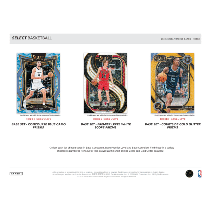 The 2024/25 Panini Select Basketball Hobby Box kicks off the season with a high-end chrome-loaded experience designed for serious collectors. Each box contains 12 packs of 5 cards each, delivering an average of three autographs or memorabilia cards, twelve base Prizm parallels, and three inserts or insert‑parallels . Collectors can chase the tiered base set—Concourse, Premier Level, and Courtside—alongside hobby-exclusive parallels like Tie‑Dye (/25), Gold (/10), Green (/5), Zebra, Gold Glitter, and ultra‑rare Black Finite (1/1) . Mid- and high-end chase content includes vibrant hobby-only inserts such as En Fuego, Select Future, Clutch, Score Select Throwback, Sky High, as well as sought-after short-printed case hits like Color Wheel, Visionary, and the new Solar Eclipse .
