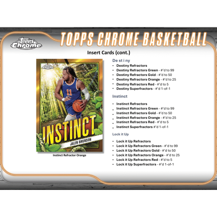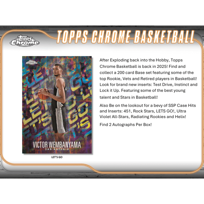 – Find tons of Inserts in Topps Chrome Basketball, Look for Iconic inserts and Brand New Inserts in 2025 Topps Chrome. Find New Inserts like: Test Drive, Instinct and Lock it Up. Also look out for SSP Case Hits: 451, Rock Stars, LETS GO!, Ultra Violet All-Stars, Radiating Rookies and Helix!