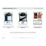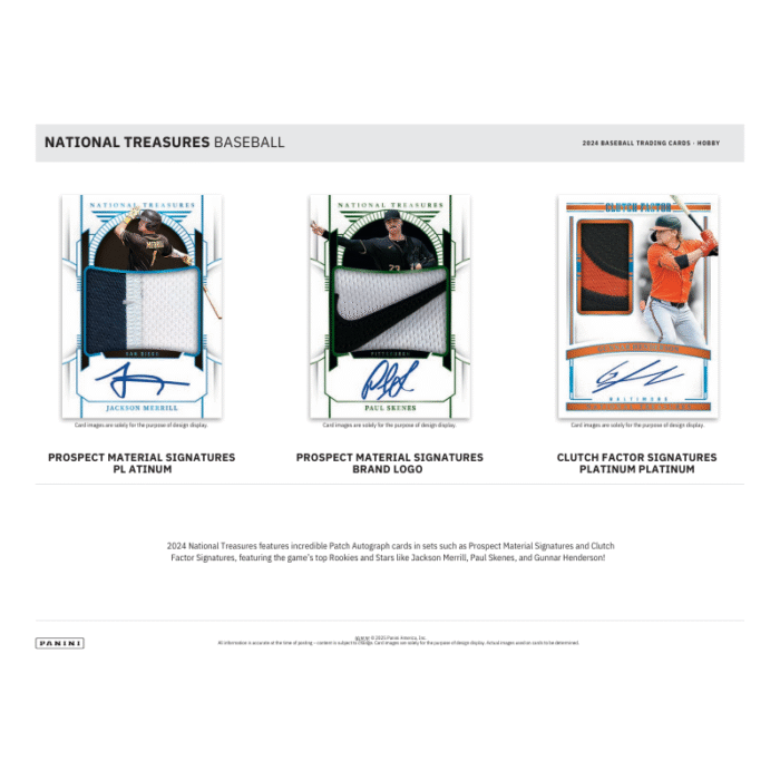 – 2024 National Treasures features incredible Patch Autograph cards in sets such as Prospect Material Signatures and Clutch Factor Signatures, featuring the game’s top Rookies and Stars like Jackson Merrill, Paul Skenes, and Gunnar Henderson!