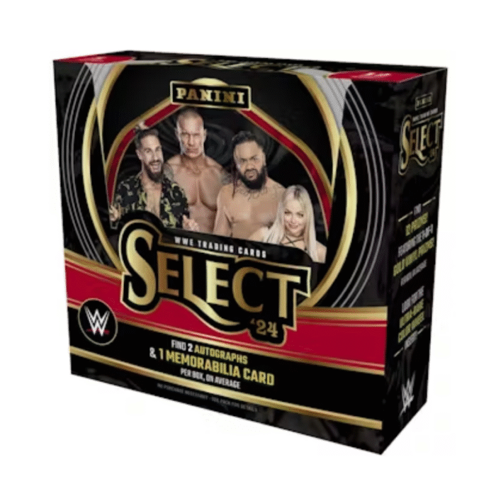The 2024 Panini Select WWE Hobby Box brings the electrifying energy of WWE to collectors with premium cards showcasing today’s top Superstars, WWE legends, and fan-favorite rookies. Each box includes a mix of stunning Prizm parallels, autographs, and memorabilia cards, with Select’s signature shiny finish and vibrant color variations. Collectors can hunt for exclusive ringside parallels, ultra-rare Zebra Prizms, and on-card autographs that add an extra layer of collectability. With its bold design and diverse set of inserts, the 2024 Select WWE Hobby Box is perfect for any WWE fan looking to add high-impact cards to their collection.