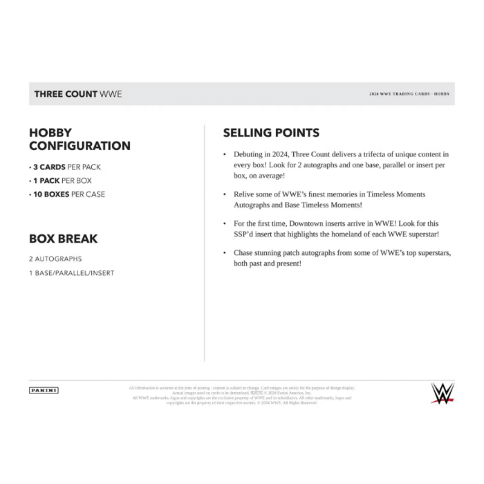 • Debuting in 2024, Three Count delivers a trifecta of unique content in every box! Look for 2 autographs and one base, parallel, or insert per box on average!