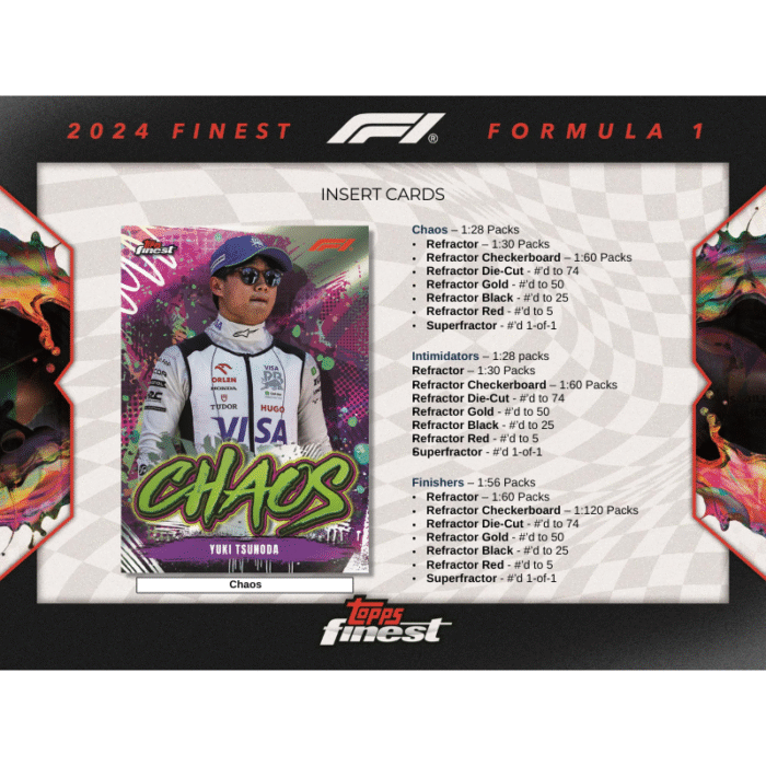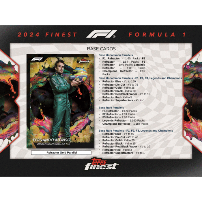 • Finest makes its Formula 1® debut with a splash including a tiered base set, a rainbow of parallels along with autographs and relics of the best to take the track!
