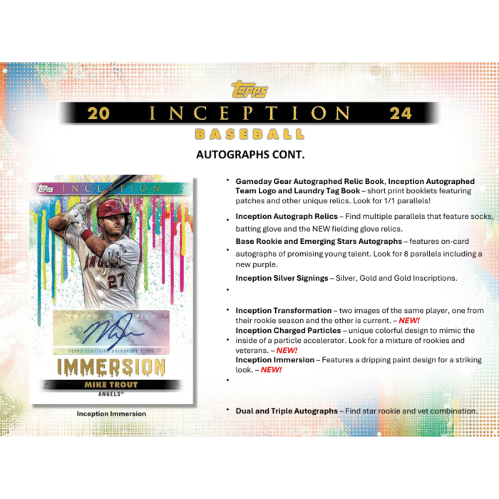 • The young stars of the MLB shine bright in 2024 Topps Inception Baseball. Collectors can find autographs and limited base cards of some of the newest players in every pack!