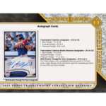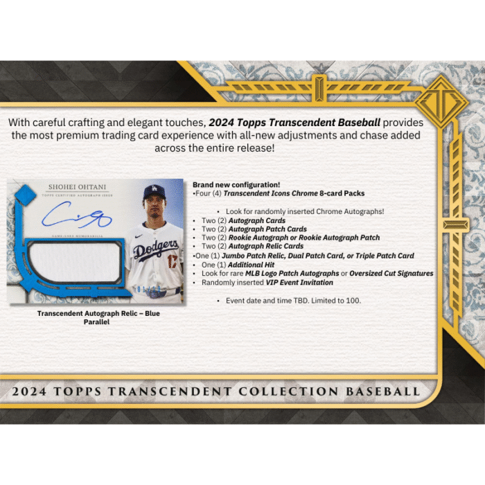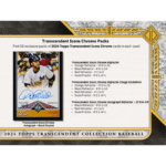 The 2024 Topps Transcendent Baseball Hobby Case is the pinnacle of luxury in sports card collecting. Limited to an exclusive print run, this premium product delivers unparalleled craftsmanship and value. Each case includes a stunning array of autographed cards from MLB’s biggest stars, past legends, and rising rookies, along with unique one-of-one collectibles. Highlights feature beautifully designed on-card autographs, rare cut signatures, oversized framed cards, and an exclusive invitation to a special Topps Transcendent Experience event. Perfect for the most dedicated baseball fans and collectors, this set is a true masterpiece celebrating the game’s greatest moments and players.