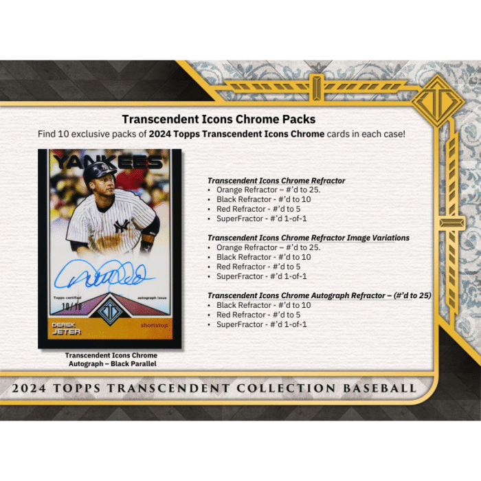 – Find 10 exclusive packs of 2024 Topps Transcendent Icons Chrome cards in each case!